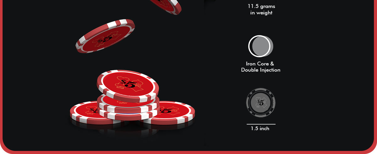 - PERFECT POKER CHIPS - These poker chips are made of top-quality materials with iron inserts for a better feel and long-lasting use. Chips each weigh 11.5 grams as same as the professional casino-grade chips, which could enhance the gaming experience.