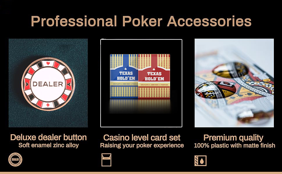 - INSIDE THE BOX - The 500 PCS CHIP SET includes 150 Chips White, 150 Chips Gold, 100 Chips Pink, 50 Chips Blue, 50 Chips Green. you'll receive 2 decks of premium quality HEITOK plastic playing cards, 5 dice, and 1 dealer button - everything you need for a killer game night. (Note: Big blind and small blind buttons not included.)