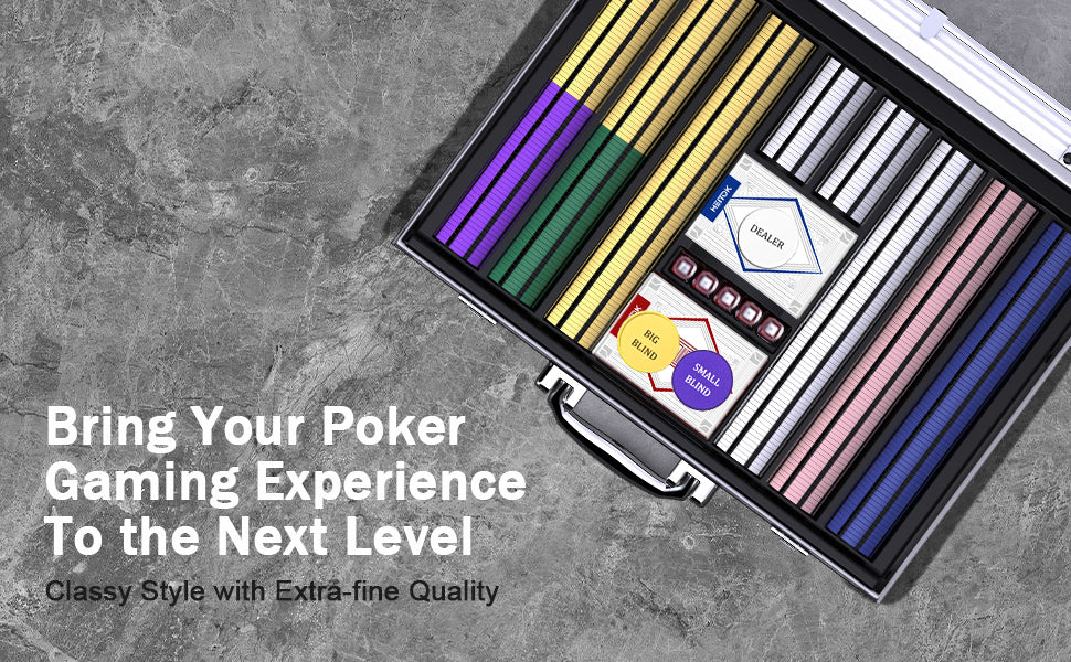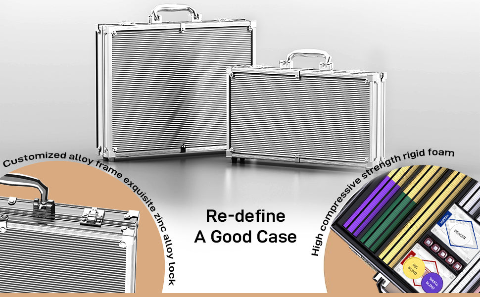 Heavy-duty aluminum carrying case with reinforced corners and soft foam interior keeps chips and accessories organized and protected. Easy to transport for travel, parties, or outdoor games -