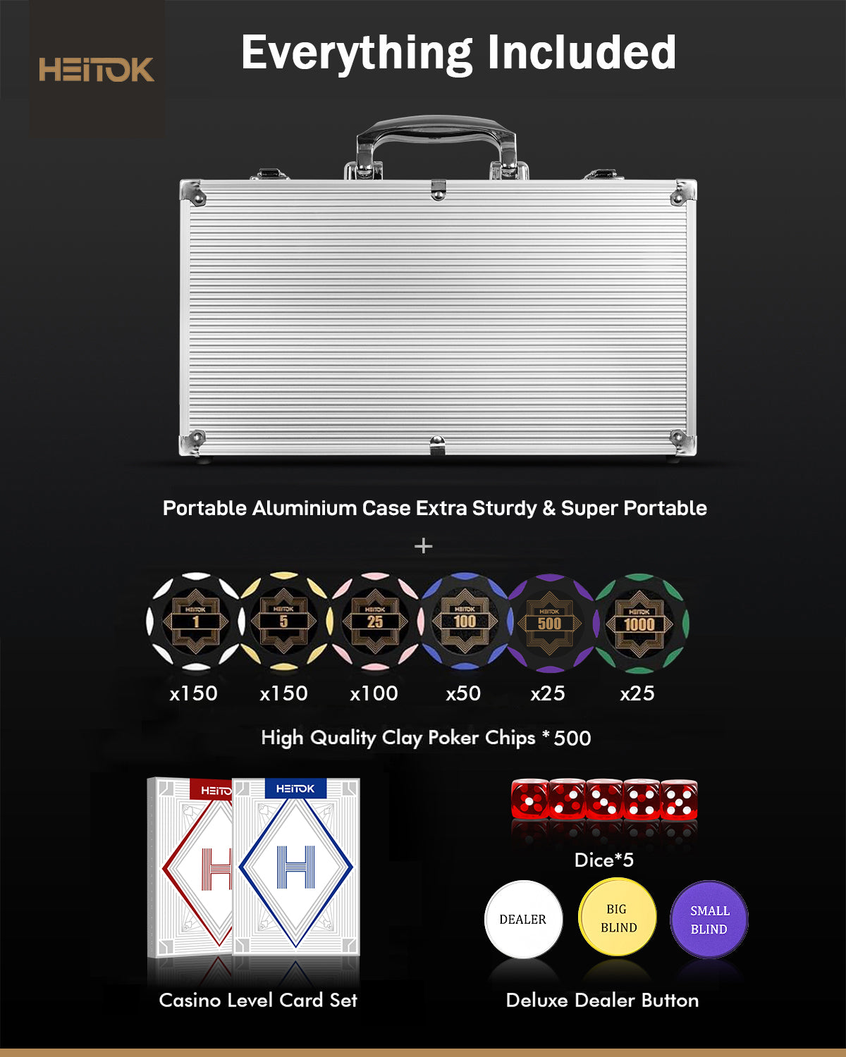 HEITOK Clay Poker Chips Set – 500pcs 14g Casino Grade Poker Chips with Denominations, Aluminum Carrying Case, 2 Decks, 5 Dice, Dealer Buttons – Professional Texas Holdem Kit for Home Game Night