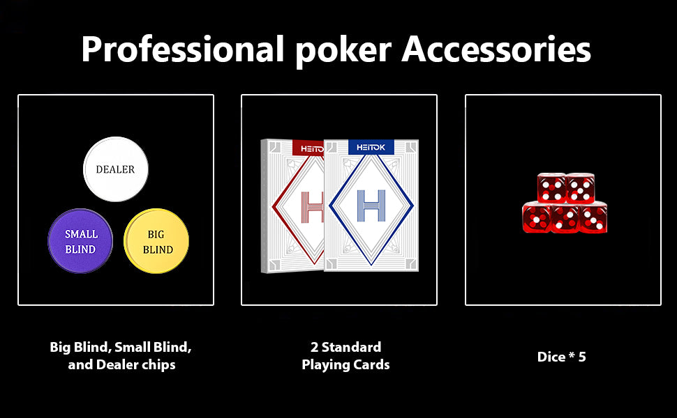 Includes 2 decks of paper playing cards, 5 dice, dealer, big blind, and small blind buttons. Everything you need for a full Texas Holdem table, no extra purchases required -