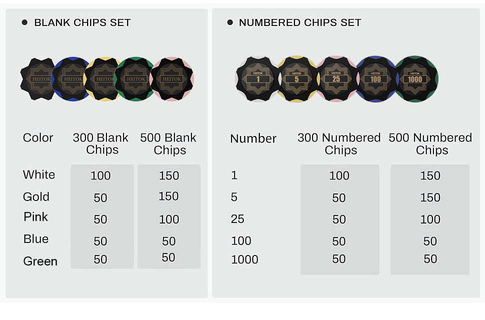 - PRODUCT DETAILS - 500 PCS CHIP SET: $1-150 Chips, $5-150 Chips, $25-100 Chips, $100-50 Chips, $500-25 Chips, $1000-25 Chips. The diameter for each chip is 1.5". All poker sets include: 2 decks of HEITOK plastic playing cards and 1 dealer. (We do not provide small blind and big blind button.)
