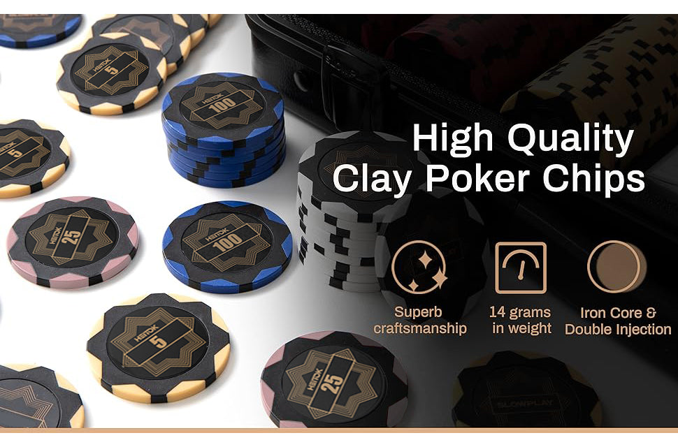 - LUXURIOUS CLAY POKER CHIPS SET - Upgrade your poker games with our professionally weighted set. Meticulously fashioned from quality clay, these chips provide a superior gaming experience reflecting authenticity.
