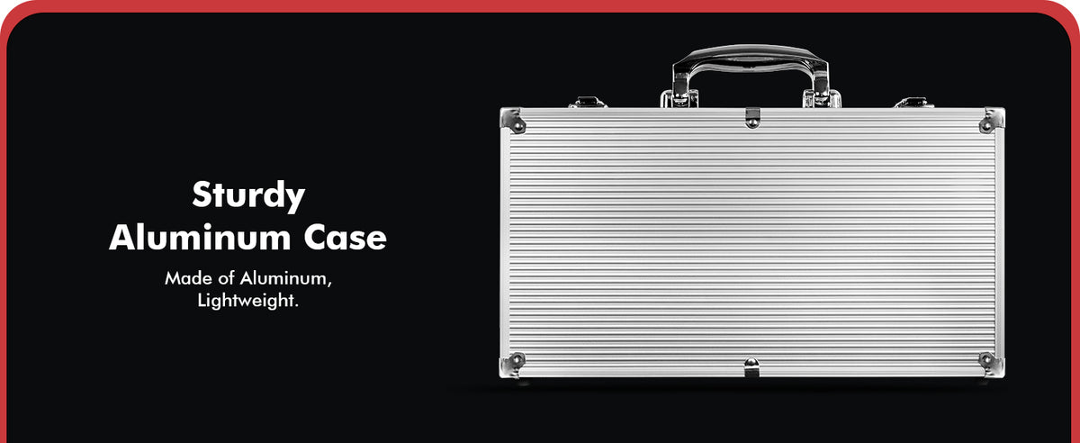 - PORTABLE ALUMINUM CASE - Embrace mobility with our premium aluminum case. Reinforced corners ensure sturdiness while dual latches secure your poker essentials. With compartments for organized storage and a swivel handle for convenience, this case is your perfect poker companion.