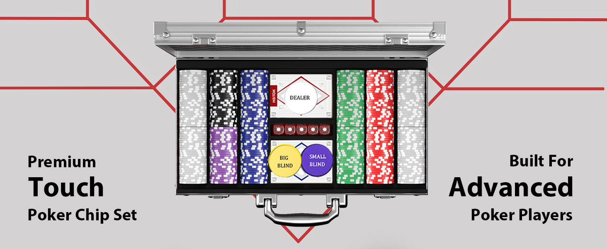 - COMPLETE POKER SET - Includes 300 poker chips, $1 gray(100 chips), $5 red(50 chips), $25 green(50 chips), $50 blue(50 chips), $100 black(25 chips), $500 purple(25 chips), 2 decks of cards, a full set of Texas Hold’Em buttons, and an aluminum carrying case.